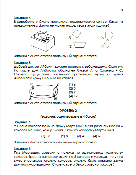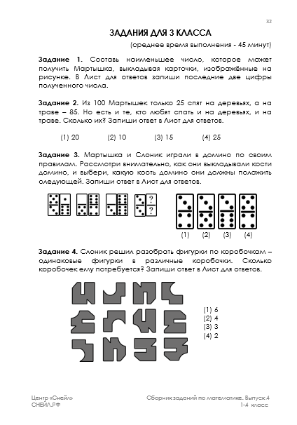 В Сборник включены 20 заданий. Задания внутри каждой возрастной группы распределены на 3 блока по уровням сложности. Сборник состоит из занимательных и нестандартных заданий, которые подобраны в соответствии с возрастными психологическими особенностями участников, требованиями программы для школ первой ступени образования и Федерального компонента государственного стандарта общего образования.